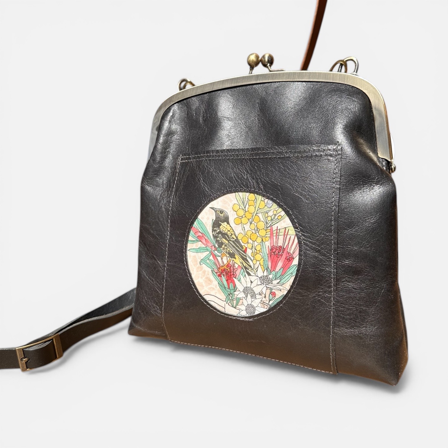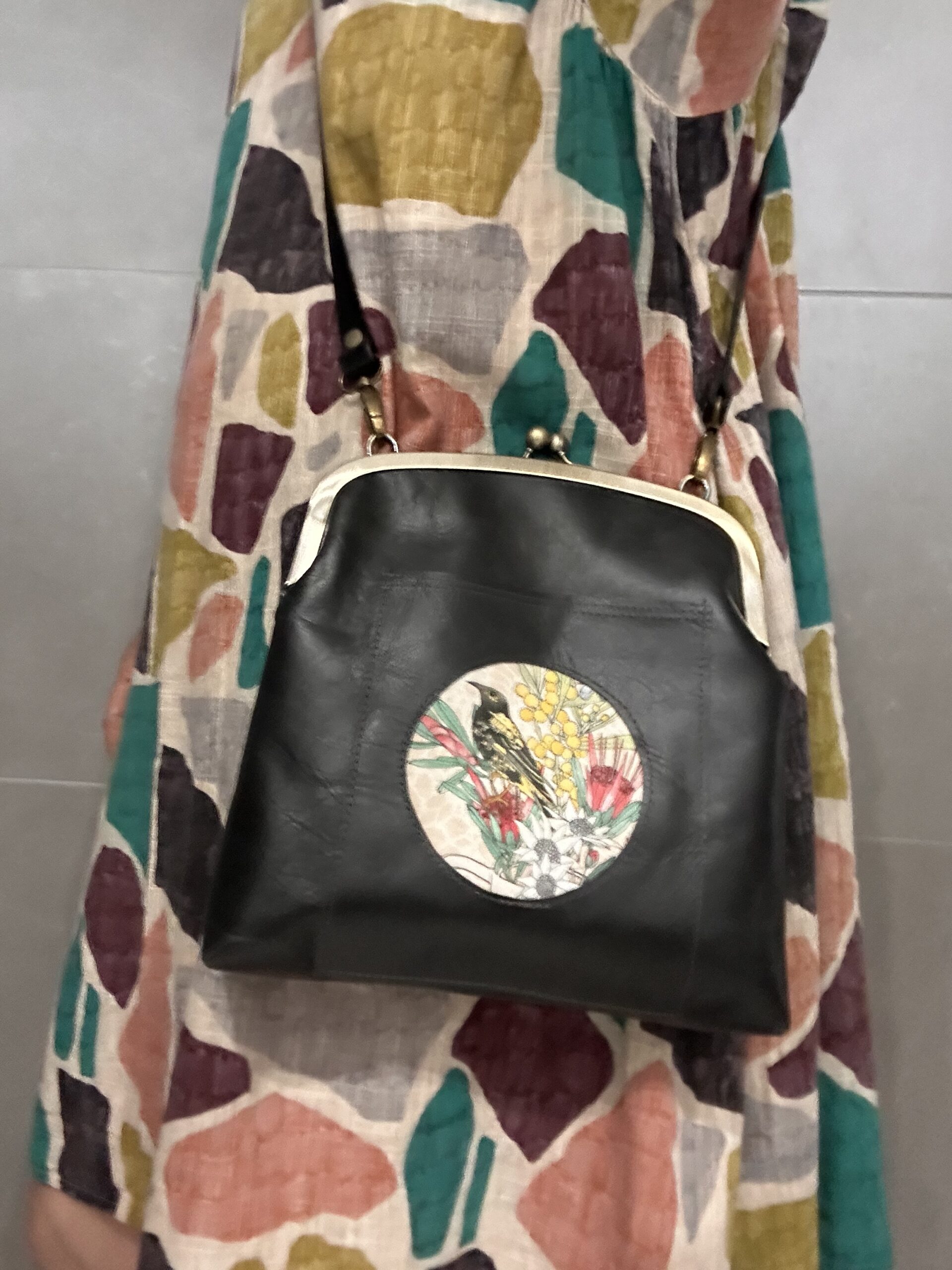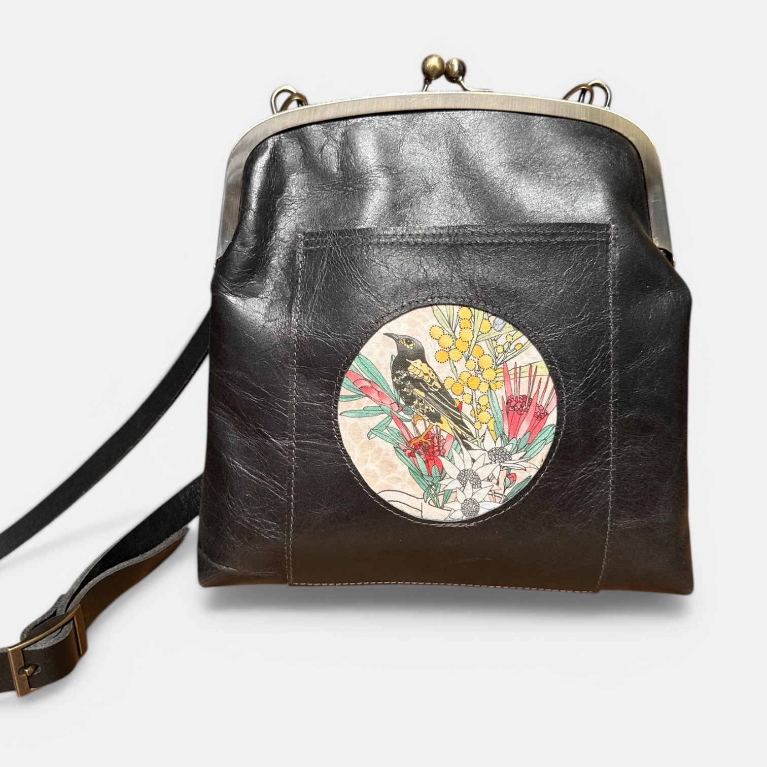The adjustable black leather strap is 140cm long and features antique brass hardware, as well as the kiss lock frame.