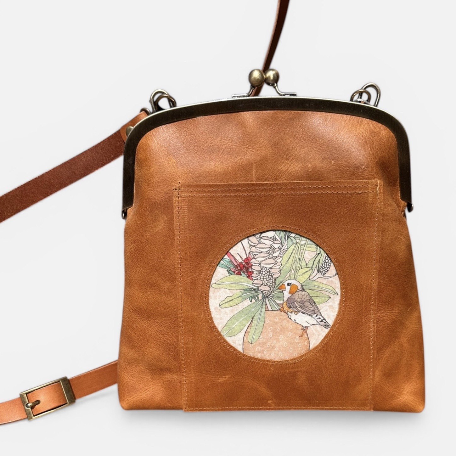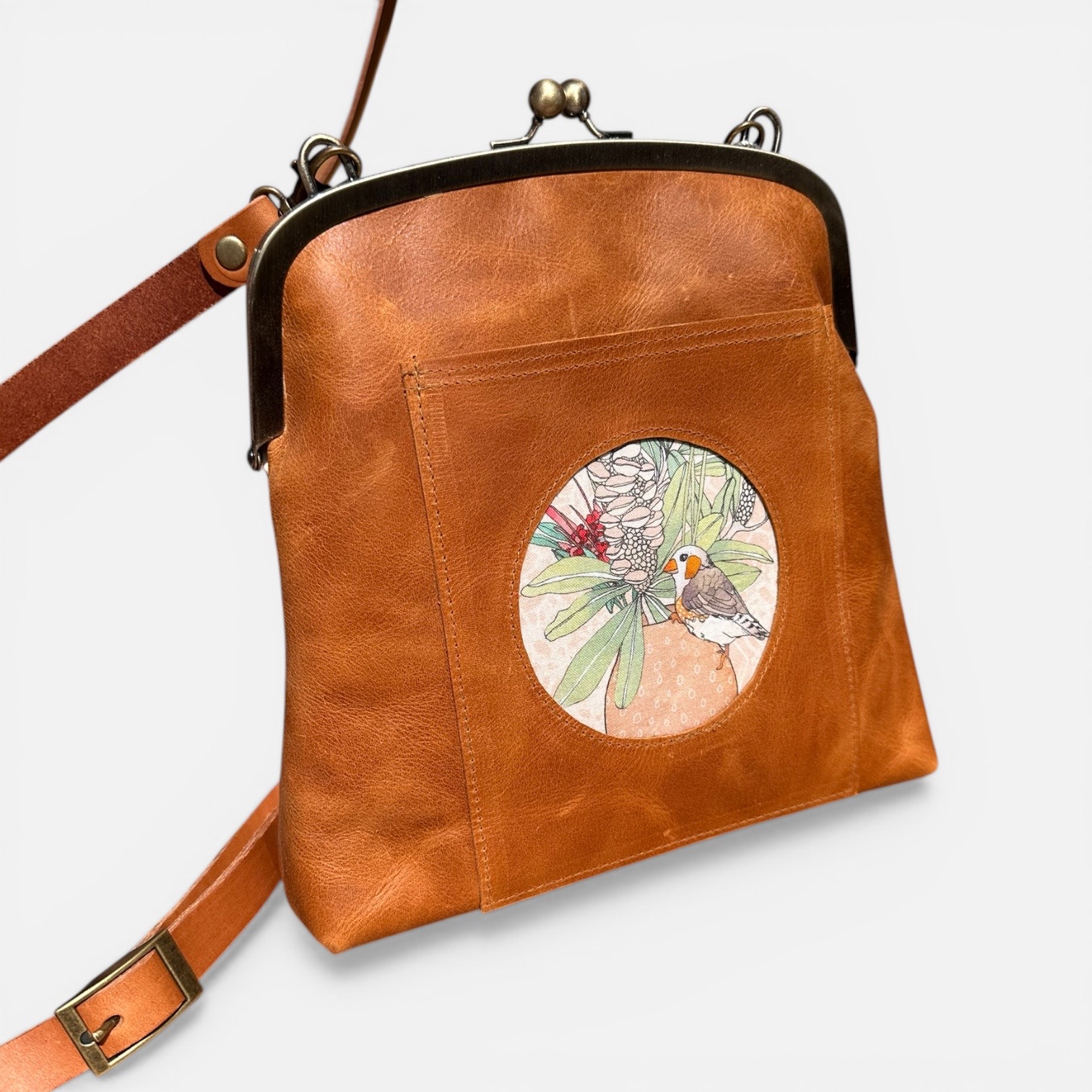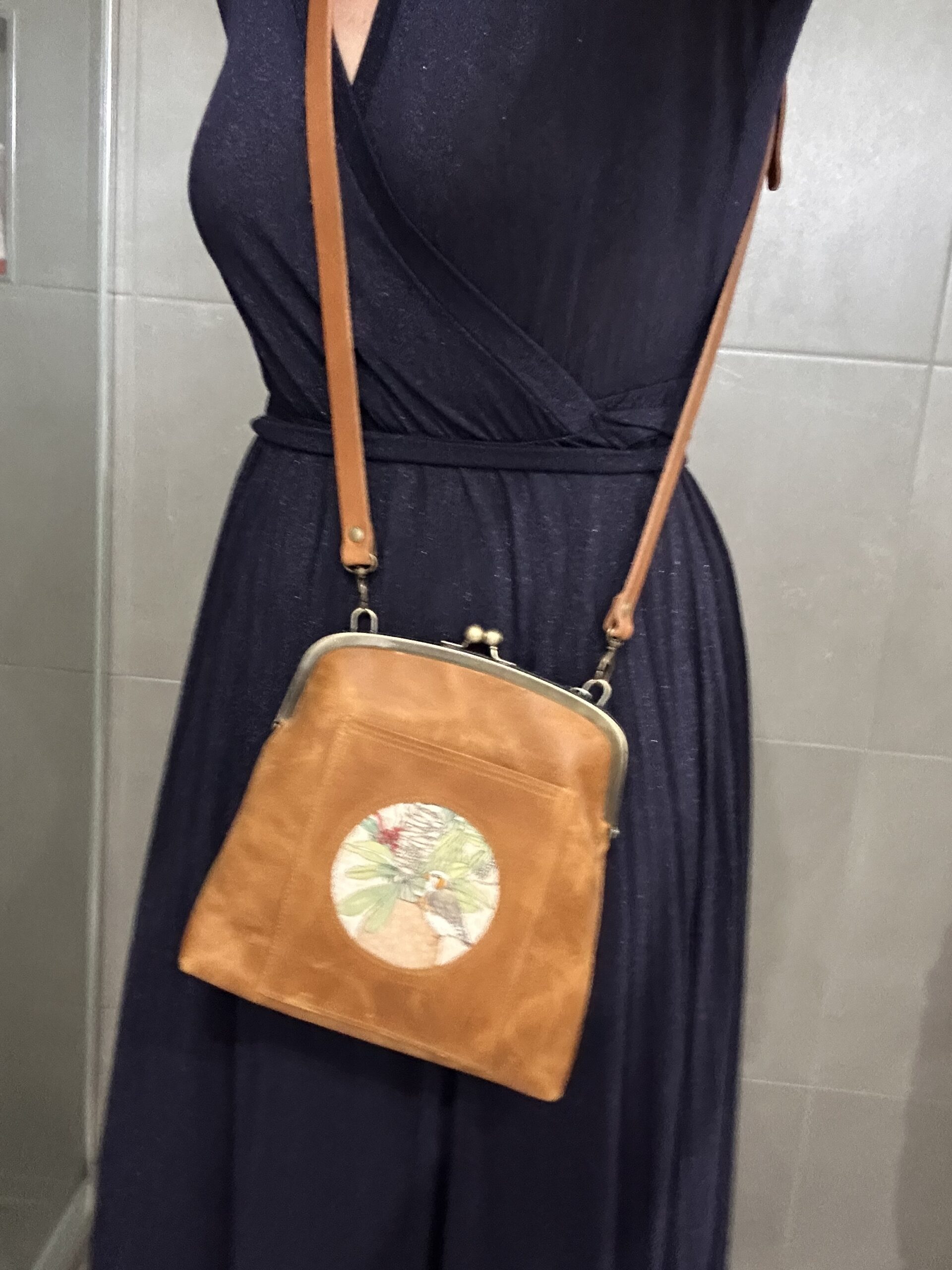 The adjustable tan leather strap is 140cm long and features antique brass hardware, as well as the kiss lock frame.