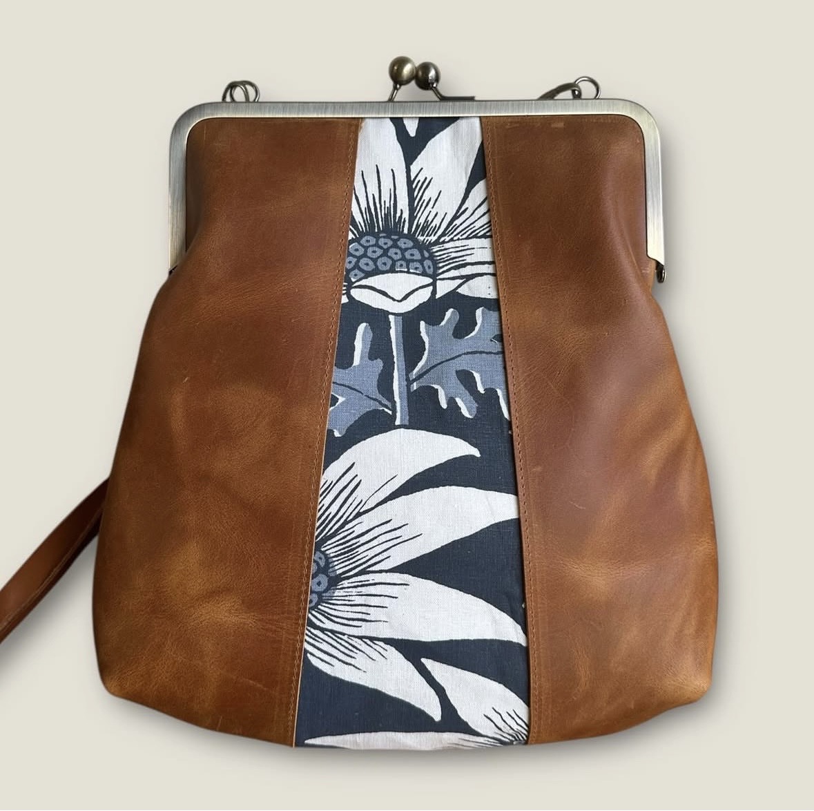 Lightly distressed, waxy tan cow leather, combined with a panel of handprinted Belgian linen by Ink & Spindle.