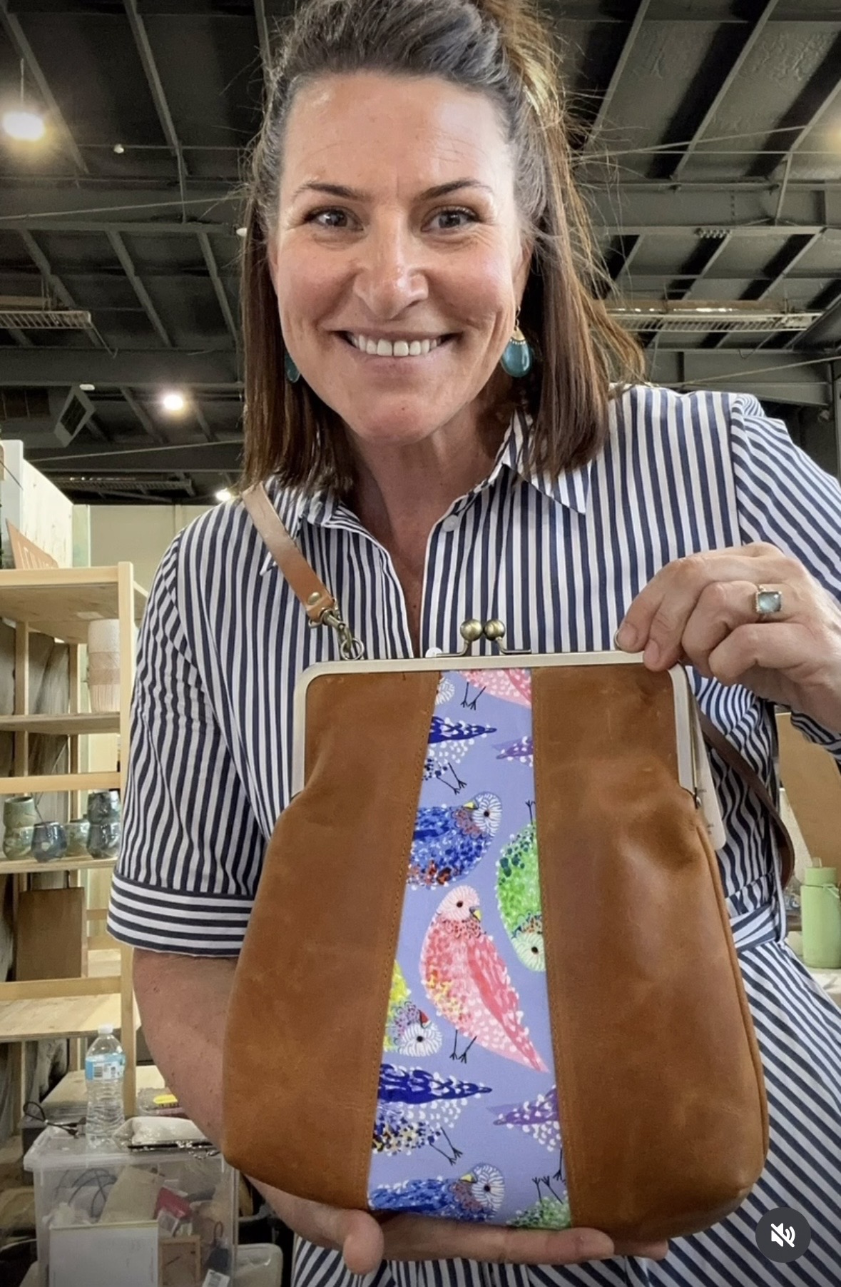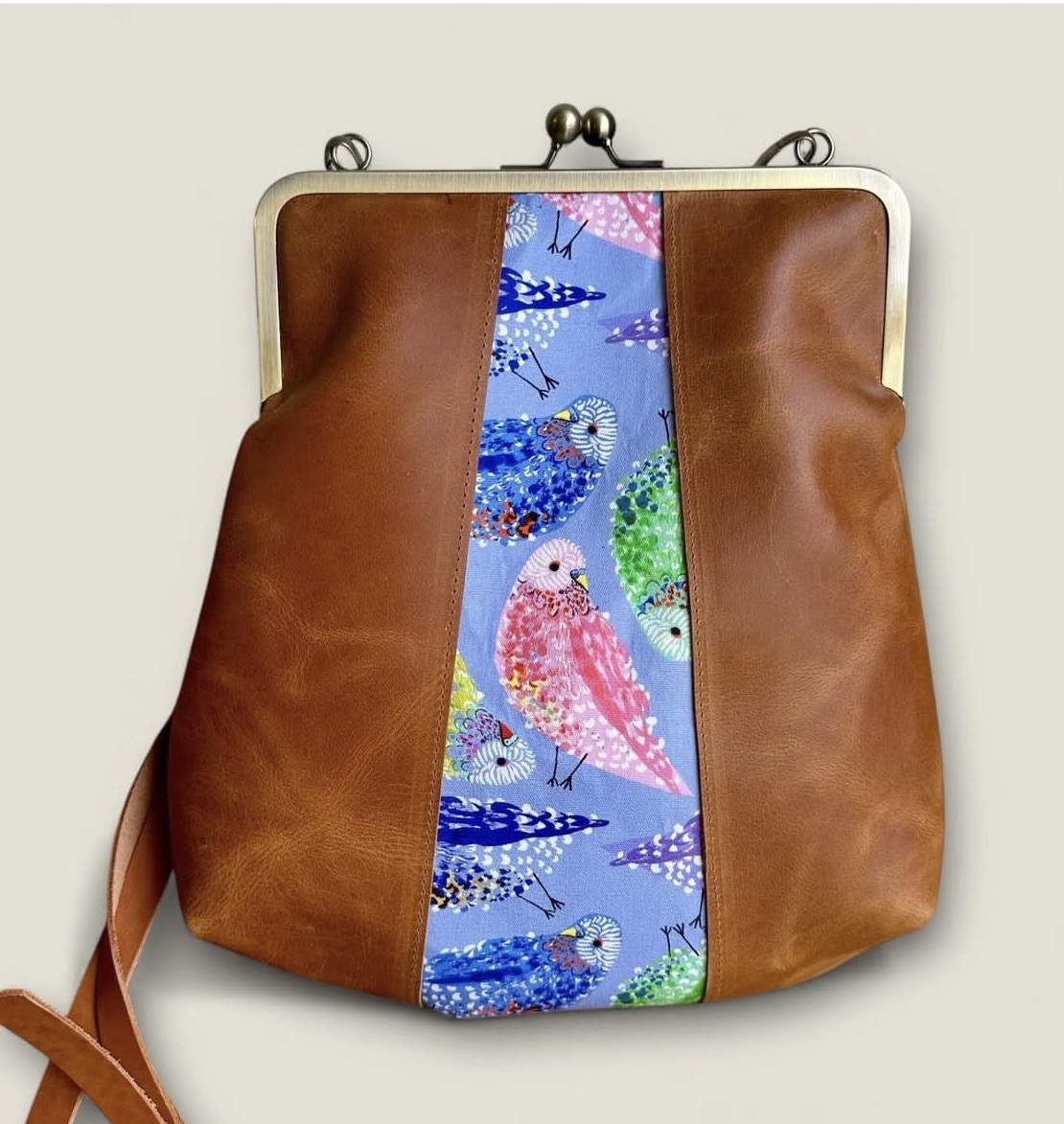 Lightly distressed, waxy tan cow leather, combined with a panel of Budgie canvas fabric by Aussies, Doops Designs.